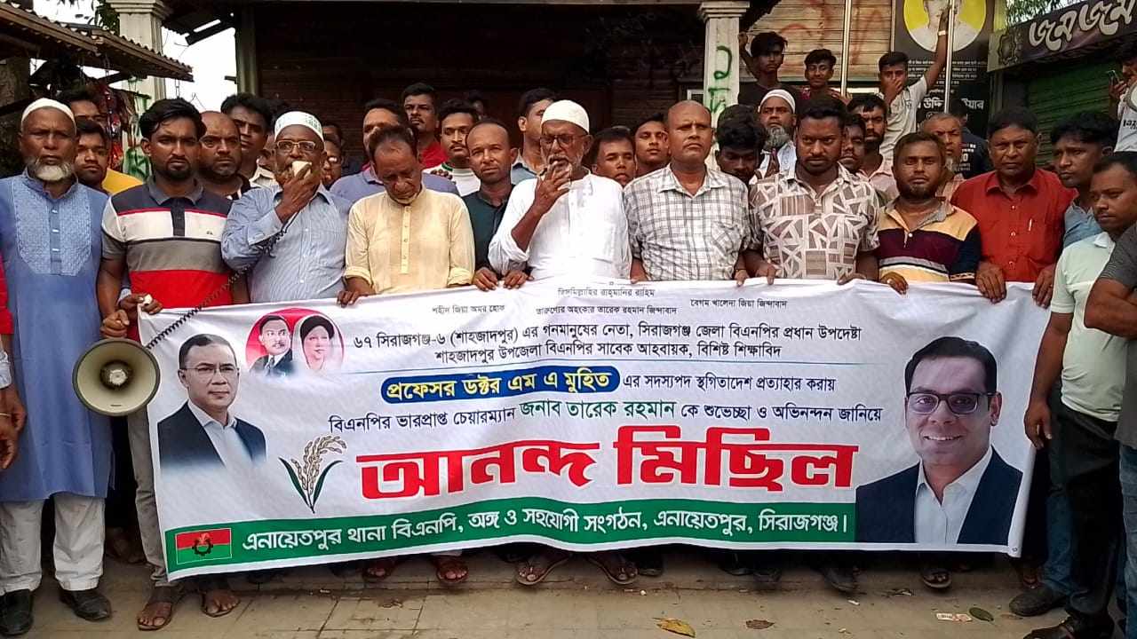 এই আয়োজনের পেছনে ছিল সিরাজগঞ্জ-৬ (শাহজাদপুর) আসনের জনপ্রিয় নেতা, বিশিষ্ট শিক্ষাবিদ, জেলা বিএনপির প্রধান উপদেষ্টা এবং শাহজাদপুর উপজেলা বিএনপির সাবেক আহ্বায়ক প্রফেসর ড. এম এ মুহিতের সদস্যপদ স্থগিতাদেশ প্রত্যাহারের সিদ্ধান্ত। এই সিদ্ধান্তকে কেন্দ্র করে এনায়েতপুর থানা বিএনপির উদ্যোগে ও সকল অঙ্গ ও সহযোগী সংগঠনের অংশগ্রহণে আয়োজিত হয় এই আনন্দ মিছিল।