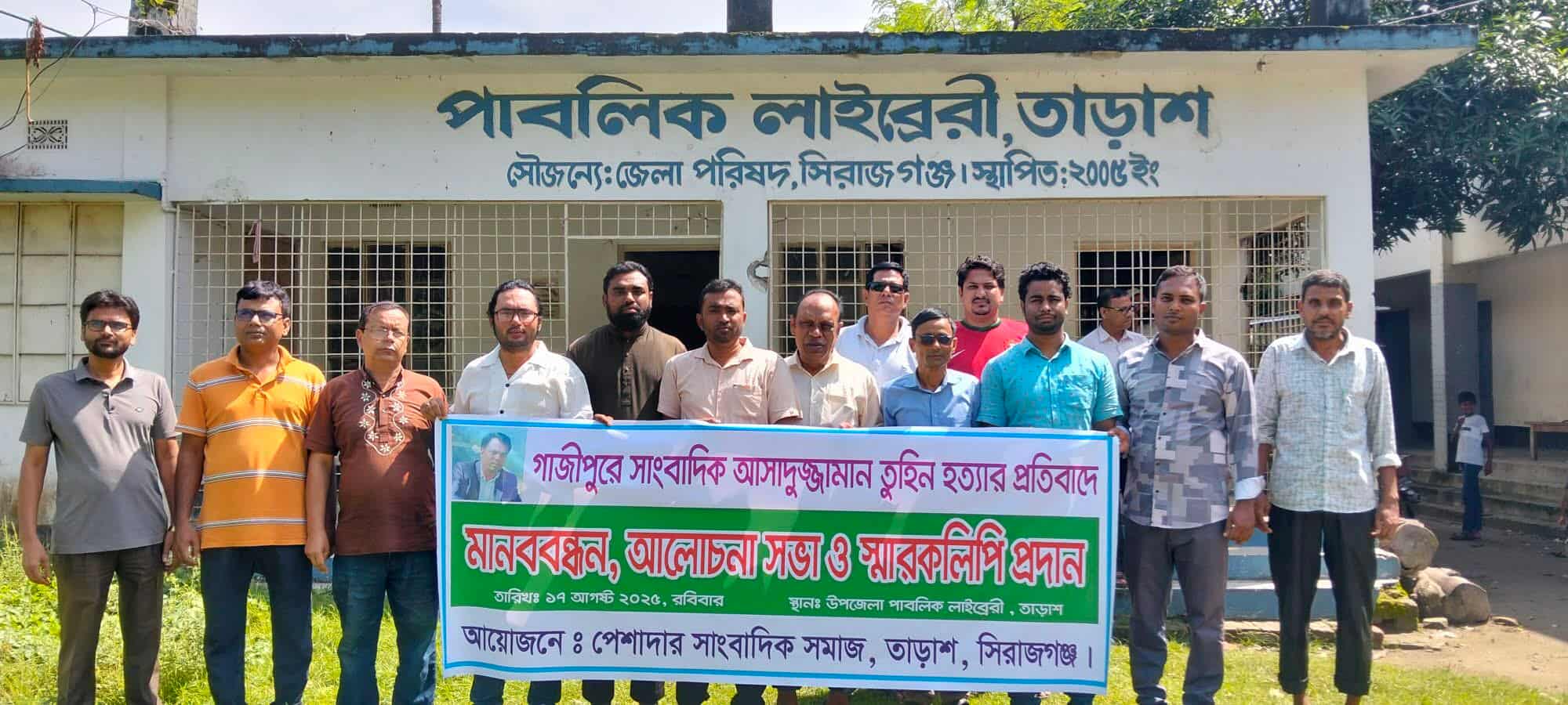 গাজীপুরের সাংবাদিক আসাদুজ্জামান তুহিন হত্যার প্রতিবাদে তাড়াশে পেশাদার সাংবাদিকদের মানববন্ধন