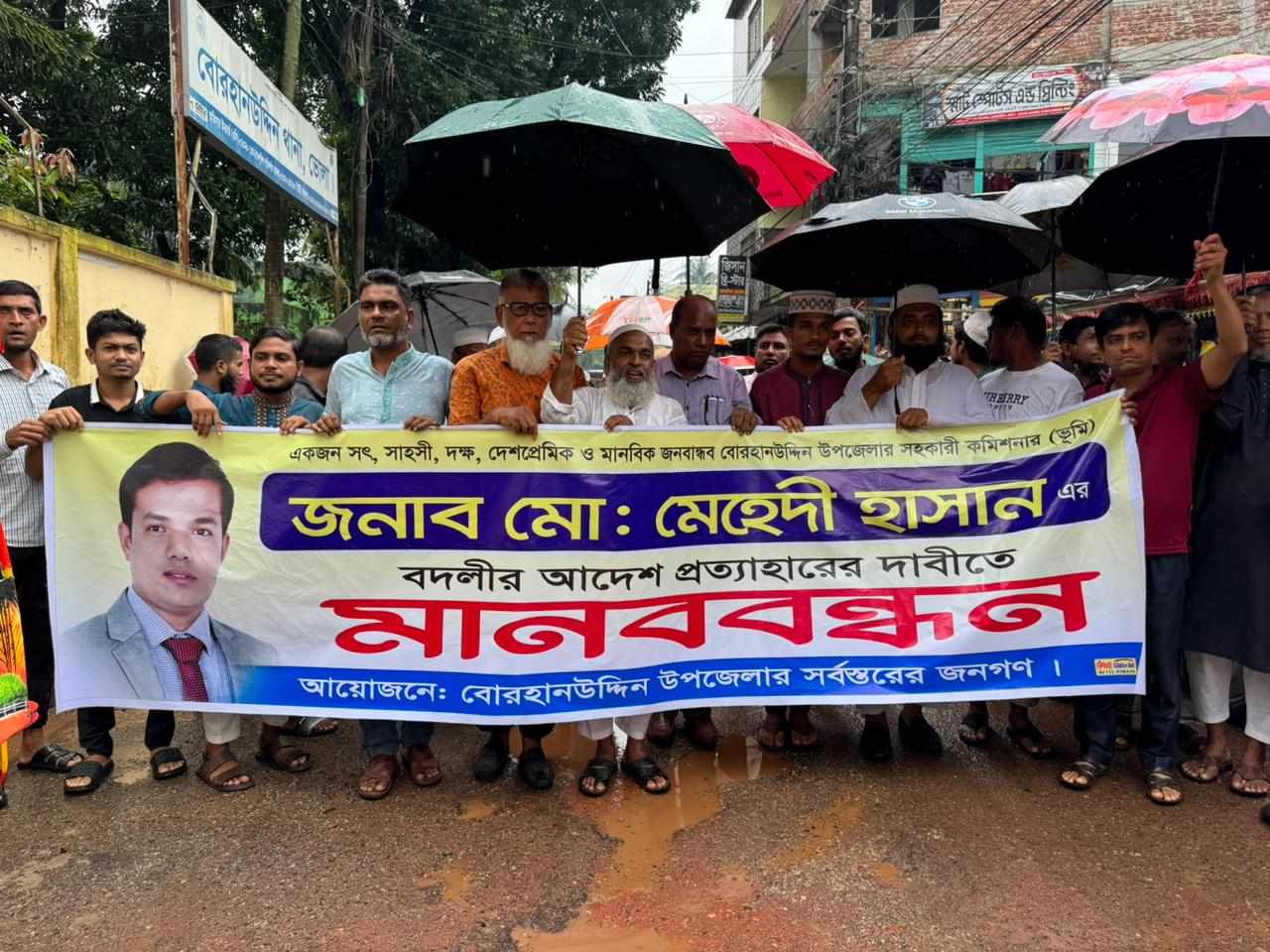 ভোলা বোরহানউদ্দিন উপজেলার সহকারী কমিশনার (ভূমি) মো. মেহেদী হাসান এর বদলী আদেশ প্রত্যাহারের দাবীতে বৃষ্টি উপেক্ষা করে মানববন্ধন, বিক্ষোভ মিছিল ও গণ স্বাক্ষর কর্মসূচি পালন করেছে বোরহানউদ্দিন উপজেলার সর্বস্তরের জনগণ। ২৩ আগস্ট; শনিবার সকাল সাড়ে ১০টায় বোরহানউদ্দিন থানার মোড়ে এ মানববন্ধন অনুষ্ঠিত হয়।