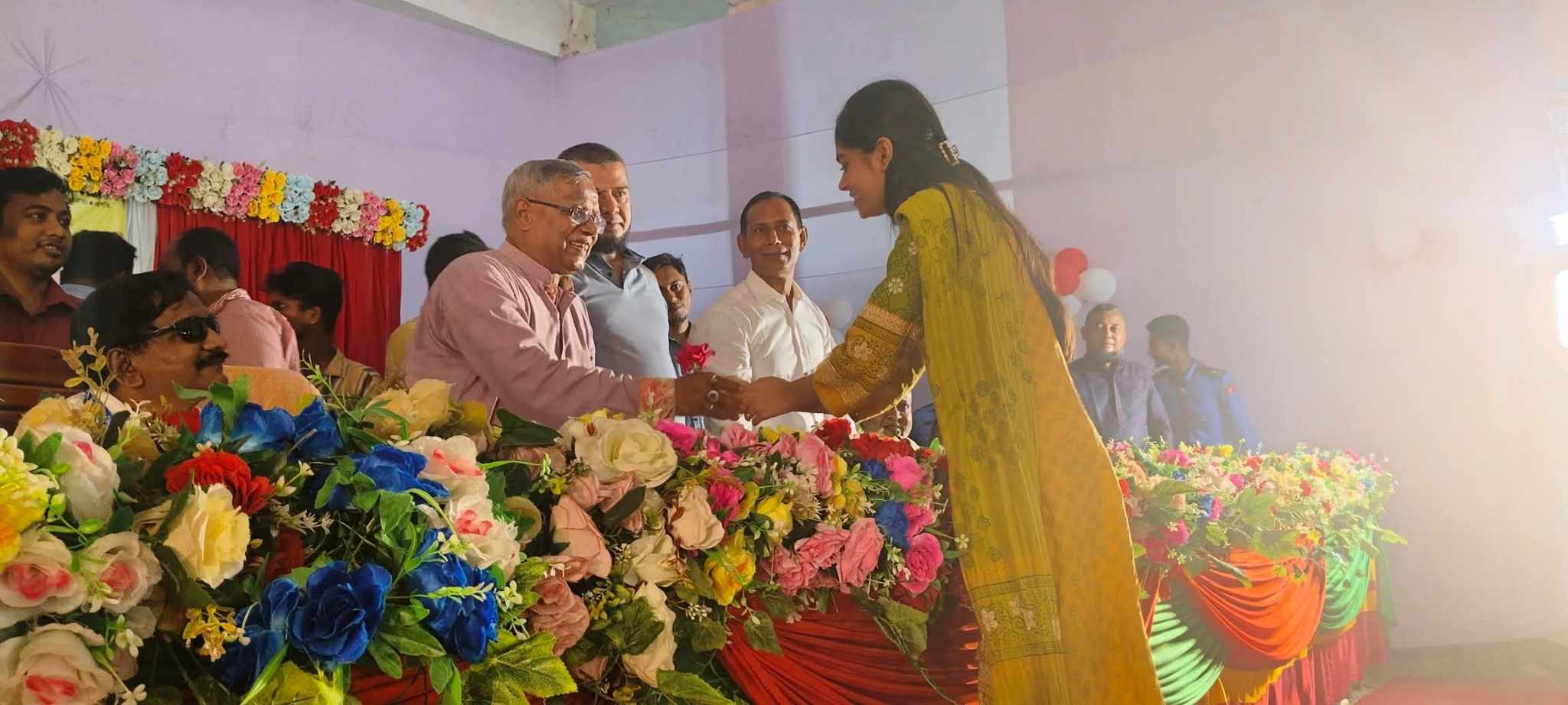 অনুষ্ঠানের শুরুতে অতিথি বৃন্দদের কে ফুল দিয়ে শুভেচ্ছা জানান শিক্ষার্থীরা।