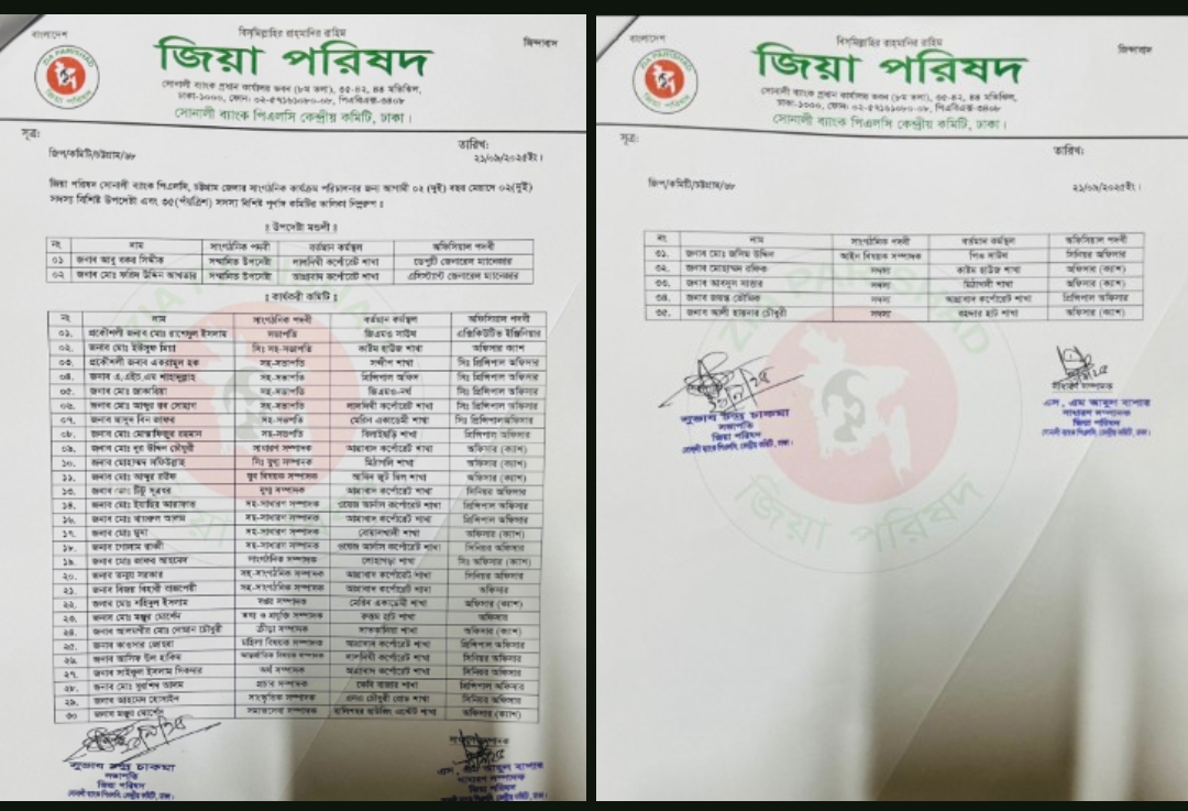গত ২১ সেপ্টেম্বর (রবিবার) জিয়া পরিষদ সেন্ট্রাল কমিটির সভাপতি সুভাষ চন্দ্র চাকমা এবং সাধারন সম্পাদক এস এম আবুল বাশার সোনালী ব্যাংক পিএলসি বৃহত্তর চট্টগ্রাম জেলার জিয়া পরিষদের ৩৭ সদস্য বিশিষ্ট পূর্ণাঙ্গ কমিটির অনুমোদন দেন