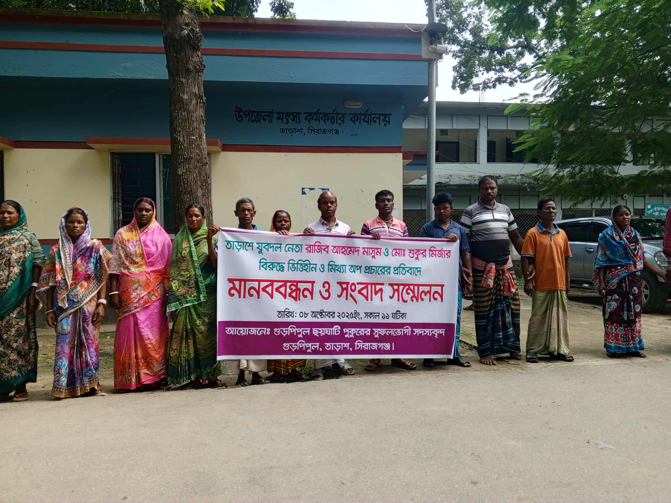 প্রতিবাদে সংবাদ সম্মেলন ও মানববন্ধ করেছেন সুফলভোগী সদস্যরা। বুধবার তাড়াশ মৎস্য অফিসের সামনে এ মানববন্ধন অনুষ্ঠিত হয় পরে তাড়াশ প্রেসক্লাব হলরুমে সংবাদ সম্মেলনে বক্তব্য রাখেন গুরপিপুল ছয়ঘাটি সুফলভোগী পুকুরের সভাপতি নিরেশ চন্দ্র দাস। তিনি বলেন,আমরা বৈধভাবে মৎস্য অফিস থেকে ডিসিআরের মাধ্যমে লিজ নিয়ে যুবদল নেতা মাসুম ও শুকুরের কাছে চাষাবাদ করতে দিয়েছি। কিন্তু কিছু দালাল শ্রেণীর লোক মিথ্যা গুজব ছড়িয়ে মানহানির চেষ্টা করতেছে। আমরা এর প্রতিবাদ জানাচ্ছি। তিনি আরো জানান,আমরা আদিবাসী জনগোষ্ঠীর মানুষ আর্থিক সমস্যার কারনে পুকুরটি নিজেরা চাষ করতে পারিনাই তাই বিভিন্ন মাছ ব্যবসায়ীদের কাছে লিজ দেওয়ার কথা বললে যুবদল নেতা রাজিব আহমেদ মাসুম ও শুকুর মির্জা উপযুক্ত টাকা দিয়ে আমাদের থেকে লিজ নেন। কিন্তু তাদের রাজনৈতিক ভাবে সন্মানহানি করতে আমাদের সুফলভোগী পুকুরের সদস্য না এমন মানুষ সাংবাদিকদের মিথ্যা তথ্য দিয়ে সন্মানহানির করতেছে যে তারা নাকি ক্ষুদ্র নৃ -গোষ্ঠী সুফলভোগীদের পুকুর দখলের চেষ্টা করছে যাহা সম্পুর্ন মিথ্যা আমরা এর প্রতিবাদ জানাচ্ছি। এ সময় পুকুরটির সুফলভোগী সদস্য ক্ষুদ্রনৃগোষ্ঠির নারী পুরুষগণ উপস্থিত ছিলেন।
