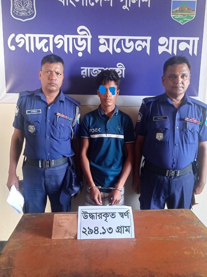 গত ২০ অক্টোবর ২০২৫ খ্রি. রাজশাহী জেলার গোদাগাড়ী থানাধীন গোদাগাড়ী পৌরসভাস্থ হাটপাড়া ঘাটের উপর পদ্মা নদীর ধার হতে রাত ০৭:৪০ টায় একজন অবৈধ স্বর্ণ চোরাকারবারিকে ৫টি সোনার বার-সহ গ্রেফতার করেছে রাজশাহী জেলার গোদাগাড়ী থানা পুলিশ।