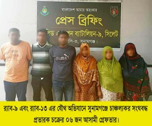 সুনামগঞ্জে ভুয়া ব্যবসায়ী সেজে প্রতারণার মাধ্যমে কোটি কোটি টাকা হাতিয়ে নেওয়া সংঘবদ্ধ প্রতারক চক্রের মূলহোতাসহ ৬ জনকে গ্রেপ্তার করেছে র‌্যাপিড অ্যাকশন ব্যাটালিয়ন (র‌্যাব)। এ ঘটনায় ১৩ নভেম্বর ২০২৫  ইং রোজ বৃহস্পতিবার  র‌্যাব-৯, সিপিসি-৩, সুনামগঞ্জ ক্যাম্পে এক প্রেস ব্রিফিং অনুষ্ঠিত হয়। সুনামগঞ্জ র‌্যাব-৯,   প্রেস ব্রিফিংয়ে  জানানো হয়, দীর্ঘদিন ধরে সুনামগঞ্জ, সিলেট, ঢাকাসহ দেশের বিভিন্ন এলাকায় প্রতারণার মাধ্যমে অর্থ আত্মসাৎ করে আসছিল একটি সংঘবদ্ধ চক্র।