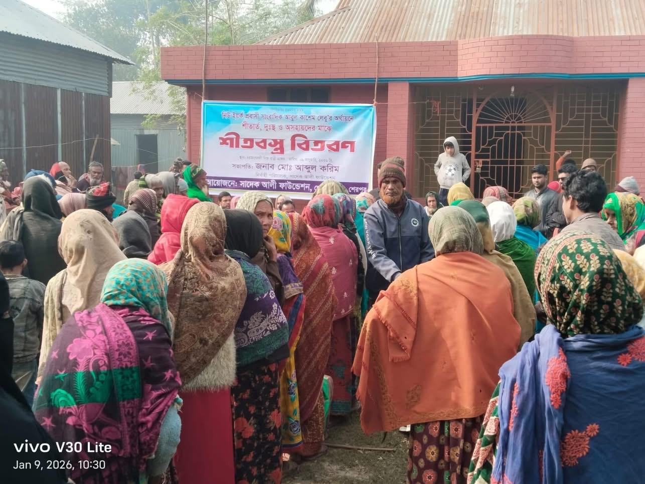 শেরপুরে শীতার্ত হতদরিদ্র মানুষের হাতে কম্বল তুলে দিলেন সাদেক আলী ফাউন্ডেশন। গত শুক্রবার, ৯ জানুয়ারি ২০২৬ শেরপুরে সদর উপজেলাধীন চর জংগলদী গ্রামে মরহুম সাদেক আলীর নিজ বাড়িতে প্রায় দু'শতাধিক দরিদ্র ও অসহায় মানুষদের মাঝে শীতবস্ত্র বিতরণ করা হয়। এ সময় সাদেক আলী ফাউন্ডেশনের নির্বাহ পরিচালক আব্দুল করিমের সভাপতিত্বে খালেদ মোশাররফ জনি’র পরিচালনায় সংক্ষিপ্ত আলোচনা সভা অনুষ্ঠিত হয়।