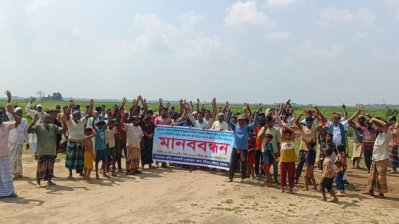 তাহিরপুরে বর্ধিত সময় পার হলেও বলদার হাওর ফসলরক্ষা বাঁধ না হওয়ায় কৃষকদের মানববন্ধন