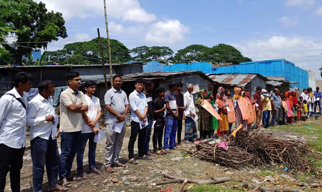 তাড়াশে আশ্রয়ণ প্রকল্পের জায়গায় অবৈধ দোকান ঘর উচ্ছেদ করার দাবীতে গ্রামবাসীর মানববন্ধ
