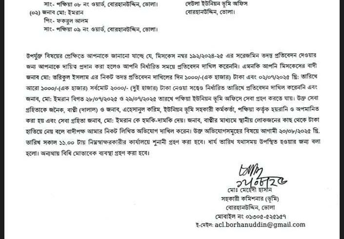 বোরহানউদ্দিনে ইউনিয়ন ভূমি উপ-সহকারী কর্মকর্তা এহেসানুল করিম এর বিরুদ্ধে ঘুষ বাণিজ্যের অভিযোগ