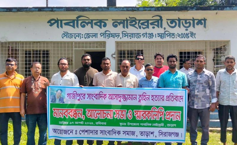 গাজীপুরের সাংবাদিক আসাদুজ্জামান তুহিন হত্যার প্রতিবাদে তাড়াশে পেশাদার সাংবাদিকদের মানববন্ধন