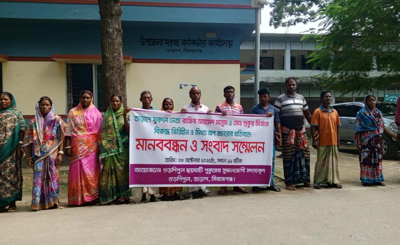 তাড়াশে যুবদল নেতাদের বিরুদ্ধে মিথ্যা পুকুর দখলের প্রতিবাদে সুফলভোগী সদস্যদের মানববন্ধন ও সংবাদ সম্মেলন