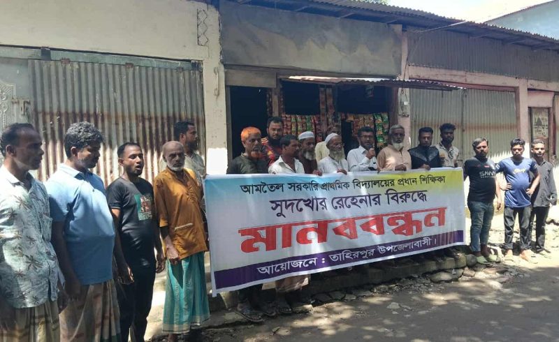তাহিরপুরে সুদখোর প্রধান শিক্ষিকা রেহেনা’র শাস্তির দাবীতে মানববন্ধন।